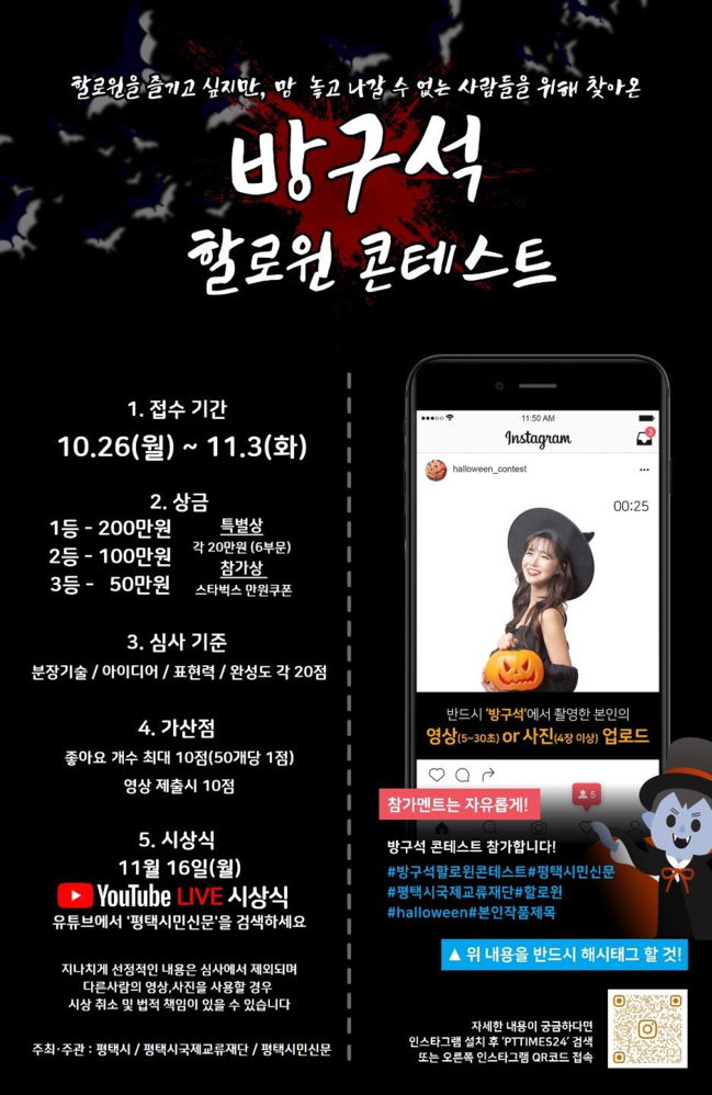 심사 분야는 분장기술·아이디어·표현력·완성도 등을 심사한다. 1등 수상자에게는 상금 200만원, 2등과 3등에게는 각각 100만원과 50만원이 수여된다. 꼬마유령상 등 6개 부문의 특별상 수상자에게는 각각 20만원의 상금을 준다. 참가자 중 50명을 무작위로 뽑아 1만원짜리 스타벅스 커피쿠폰도 증정한다. 시상식은 11월 16일 오후 9시 유튜브 ‘평택시민신문’에서 실시간으로 볼 수 있다.