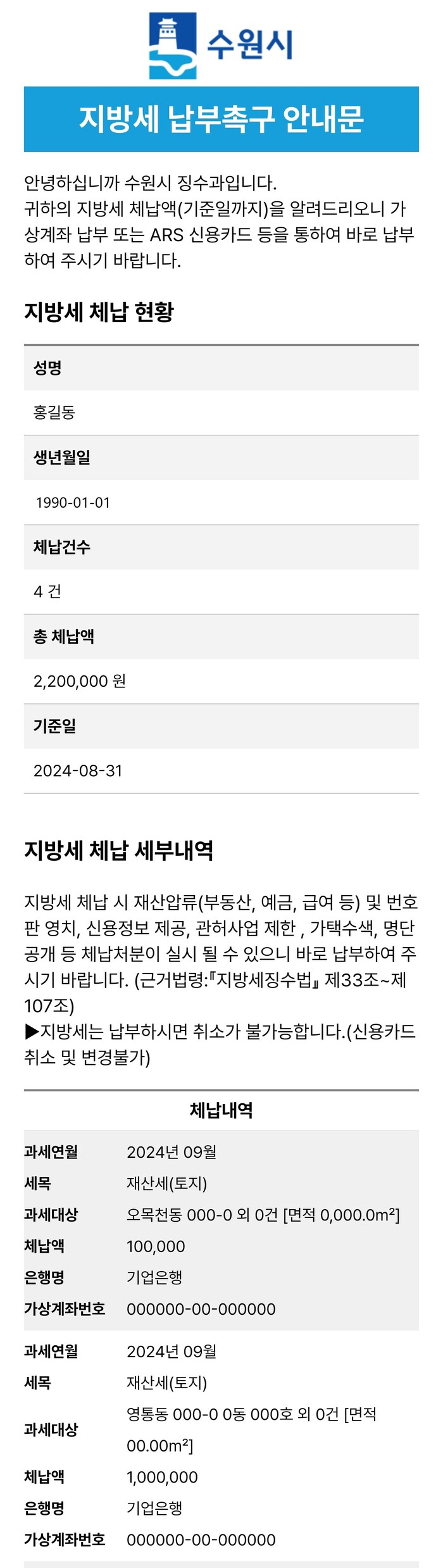 사진/모바일 전자고지시스템을 활용해 발송하는 지방세·세외수입 체납안내문 예시.(수원시 제공)