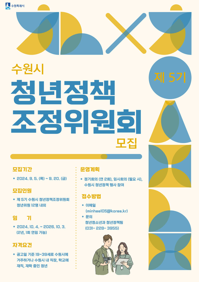 수원시(시장 이재준)가 9월 20일까지 제5기 수원시 청년정책조정위원회 청년 위원 모집한다.