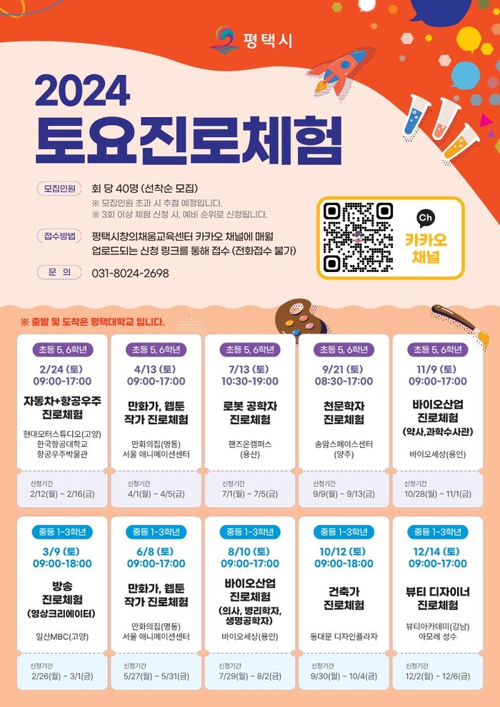 2024년 토요진로체험은 앞으로 총 8회의 체험 일정이 남아있으며 자세한 사항은 평택시창의채움교육센터 카카오톡 플러스친구 및 네이버 밴드 가입 후 확인할 수 있다.