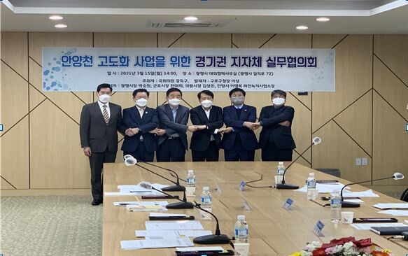 이날 회의에는 강득구 국회의원, 박승원 광명시장, 이성 구로구청장, 한대희 군포시장, 김상돈 의왕시장, 이명복 안양시 하천녹지사업소장이 참석했으며, 회의에서는 지자체가 연대하여 경기에서 서울까지 안양천 100리길을 친환경 하천으로 조성하고 안양천을 한강 고수부지에 뒤지지 않을 시민 휴식 공간으로 만들자고 의견을 모았다.