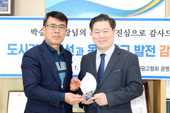 박승원 광명시장이 29일 (사)경기도옥외광고협회 광명시지부로부터 올바른 광고문화 조성과 옥외광고산업 발전에 힘써준 데 대한 감사패를 받았다. 전달식에는 김영일 경기도옥외광고협회 광명시지부장과 협회 임원진 등이 참석했다.