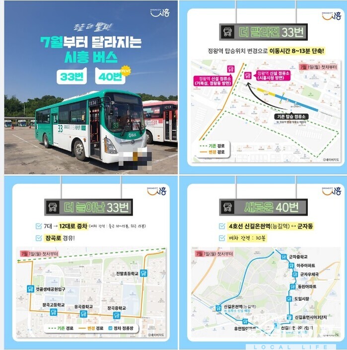 26일, 시흥시청은 페이스북에 “조금 더 빨리! 7월부터 달라지는 시흥 버스”라는 제목의 글을 통해 ▲33번, 40번(NEW!) 탑승위치 변경으로 더 빨라지고 증차하여 더 늘어난 33번 ▲거북섬동, 정왕동과 시흥시청역 간 이동시간 단축(8~13분)을 위한 탑승위치 변경(정왕역 환승정류소 미정차) ▲운행대수 증차(7대->12대) 및 장곡로 경유 ▲4호선 신길온천역(능길역)과 군자동을 이어주는 NEW! 40번 신설 운행 ▲4호선 신길온천역(능길역)과 군자동 시계방면 편도 운행 등의 변경 소식을 전했다.