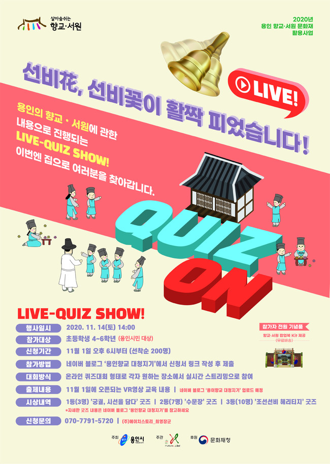 [로컬라이프] 용인시는 10일 집에서 즐기는 향교 ‧ 서원에 대한 온라인 퀴즈쇼에 참가할 관내 초등 4~6년생 200명을 14일까지 모집한다고 밝혔다.