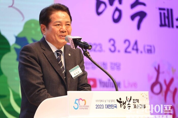 | ▲ 최대호 안양시장이 ‘2023년 대한민국 행복 정책 페스티벌’에서 인사말을 하고 있다. (사진출처=최대호 페이스북) |