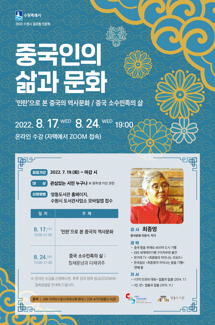 수원시 영통도서관 홈페이지(www.suwonlib.go.kr/yt) ‘통합예약/신청→독서문화프로그램’에서 ‘(온라인) 2022년 글로벌 인문학 <중국인의 삶과 문화>’를 선택해 신청하면 된다. 시민 누구나(중학생 이상 권장) 무료로 참여할 수 있다.