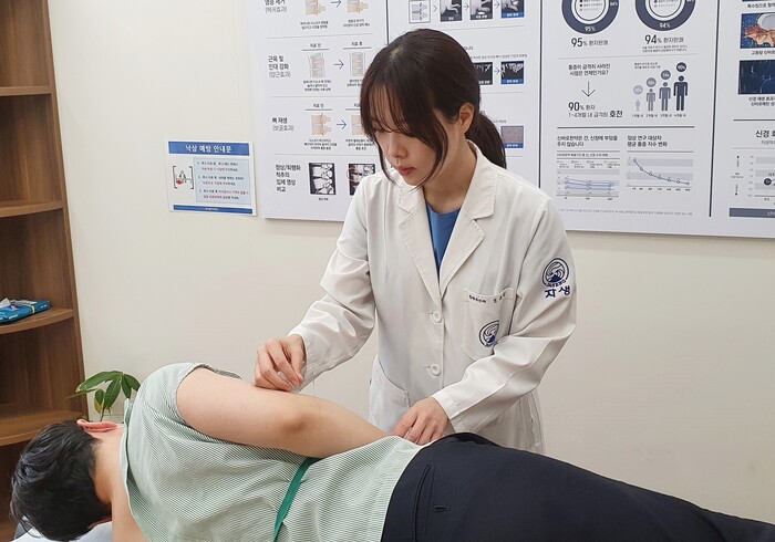 사진/ 자생한방병원 조유진 한의사가 외측상과염 환자에게 침 치료를 하고 있다.(사진제공=자생한방병원)