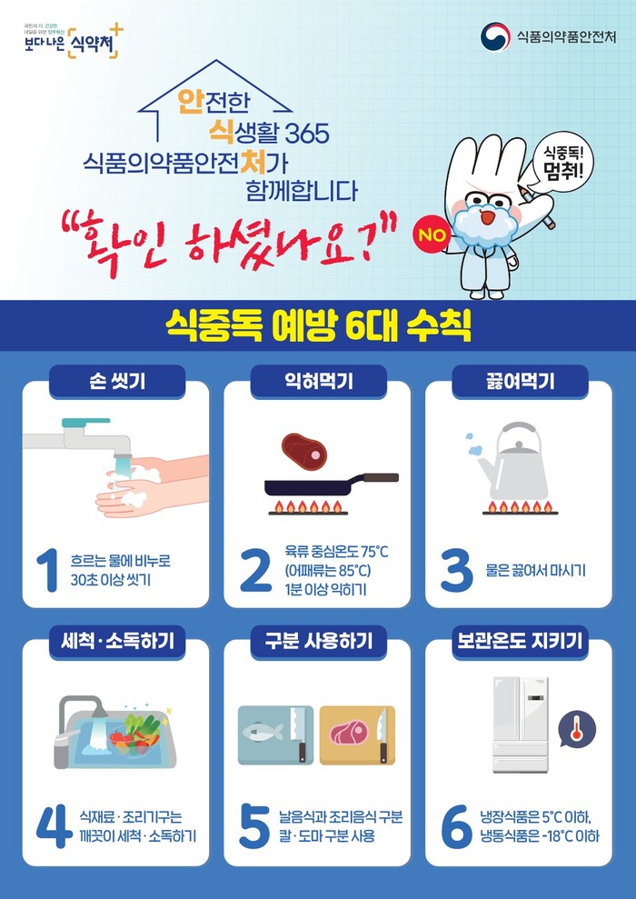 우선 ▲음식 조리 전, 육류.계란 등의 식재료를 만진 뒤, 식사 전, 화장실 이용 후, 외출했다 돌아와서 반드시 손 씻기 ▲음식은 충분히 익힌 뒤 차가운 음식은 5℃ 이하, 따뜻한 음식은 60℃ 이상에서 보관 후 제공하되 대량으로 조리 후 실온에서 식혔다면 충분히 재가열한 뒤 섭취하기 ▲지하수는 반드시 끓여 먹고, 지하수를 식품 용수로 이용할 때에는 살균·소독장치를 설치하고 주기적으로 관리하기 ▲육류와 어패류 등 익히지 않은 식재료와 어묵, 계란 지단 등 바로 먹는 식품은 교차 오염이 발생하지 않도록 칼, 도마, 용기 등을 구분해 사용하기 등이다.