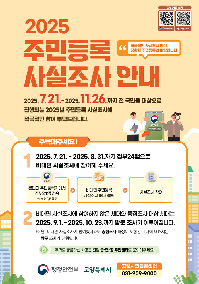 고양특례시(특례시장 이동환)는 고양시 전 세대를 대상으로 21일부터 11월 26일까지 ‘2025년 주민등록 사실조사’를 실시한다고 밝혔다.