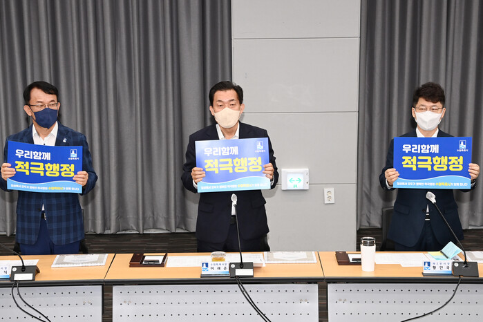 사진/이재준 수원시장(가운데), 조청식 제1부시장(오른쪽), 황인국 제2부시장(왼쪽)이 적극행정 실천을 다짐하고 있다.(사진제공=수원시)