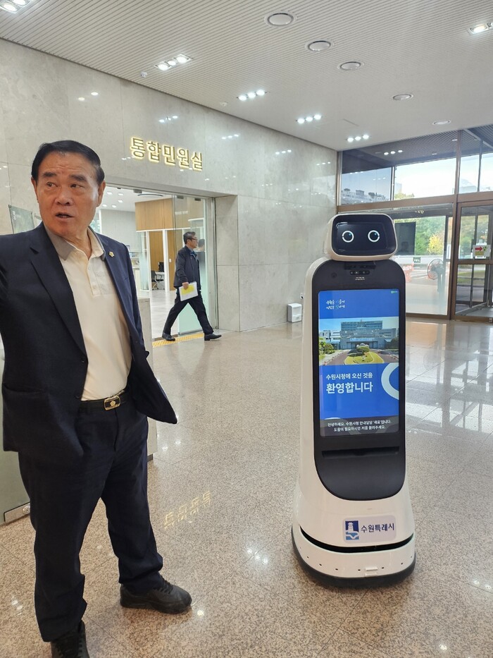 수원특례시의회 이재식 의장이 수원시청 1층에서 맞춤형 민원서비스 제공을 위해 운영 중인 AI 서비스민원 로봇을 체험하고 있다.