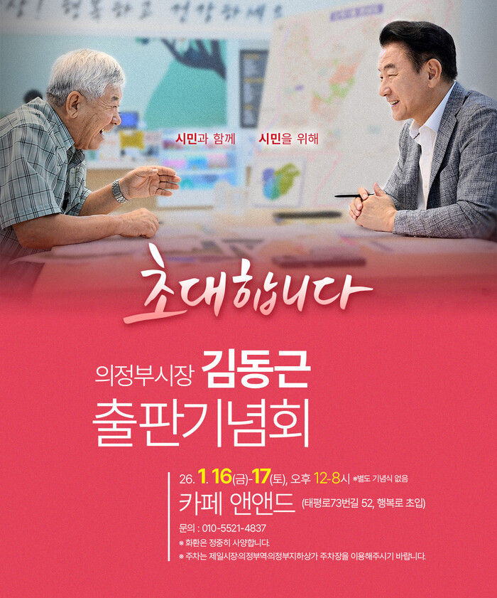 한편, 김동근 의정부시장의 출판기념회는 1월 16일(금)과 17일(토) 오후 12~8시, ‘카페 앤앤드’(태평로 73번길 52, 행복로 초입)에서 열린다.
