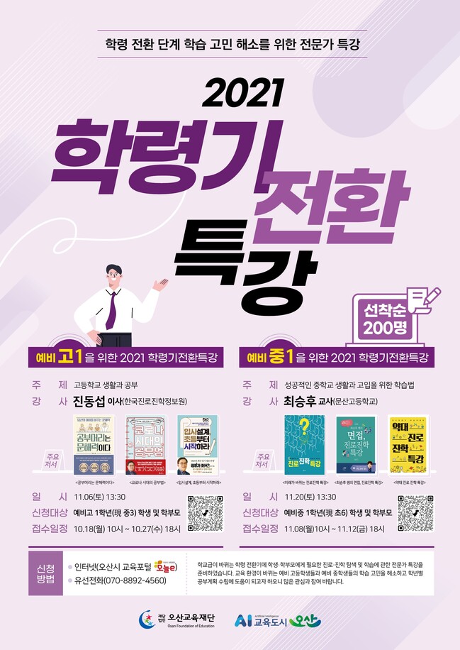 오산교육재단 조기봉 상임이사는 “자녀 교육에 대한 오산 시민의 관심이 날로 높아지고 있는 가운데, 내년에 중학교와 고등학교를 진학하는 학생과 학부모님의 고민을 조금이나마 덜어드리고자 교육분야 전문가 두 분을 모시고 특강을 마련했다.”며 “오산의 아이들이 상급학교 진학에 불안감을 가지지 않고 자기만의 학습법을 통해 다양한 진로를 찾을 수 있도록 많은 프로그램을 준비하겠다.”고 전했다.