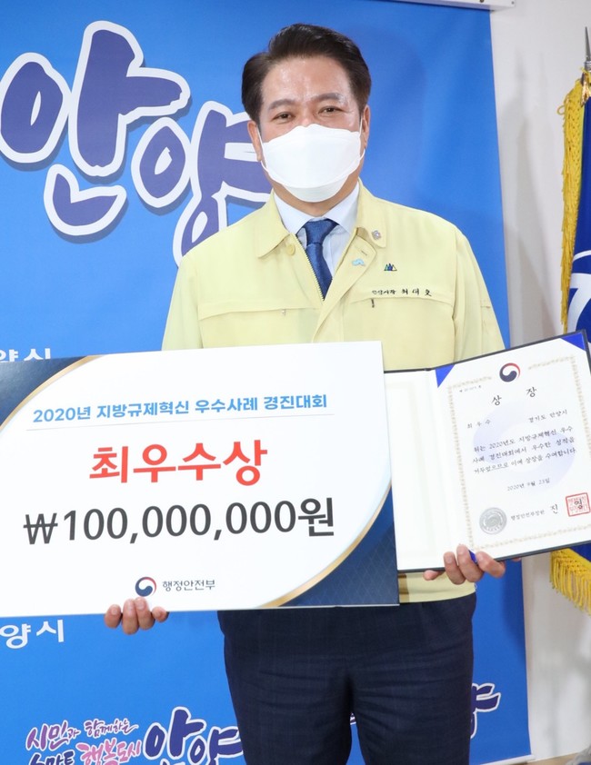 그간 안양시는 행정안전부 주관 지방규제혁신 우수사례 경진대회 2년 연속 전국 1위, 민생규제 혁신과제 공모전 우수과제 선정, 조달청 수요자제안형 혁신시제품 도전적 과제 공모 선정, 제1회 산업융합 규제특례심의위원회 실증특례 승인 등 규제혁신 분야에서 탁월한 역량을 나타냈다.