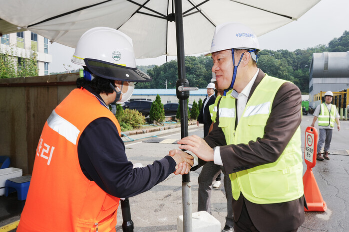 사진/이재준 수원시장이 자원순환센터를 방문해 근무자를 격려하고 있다.(사진제공=수원시)
