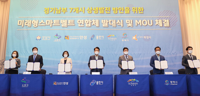 이날 백군기 용인시장, 은수미 성남시장, 염태영 수원시장, 김보라 안성시장, 엄태준 이천시장, 정장선 평택시장, 서철모 화성시장 등 7개 지자체 단체장이 공동으로 협약을 맺고 미래형 스마트벨트 연합체 구축 결의를 다졌다.