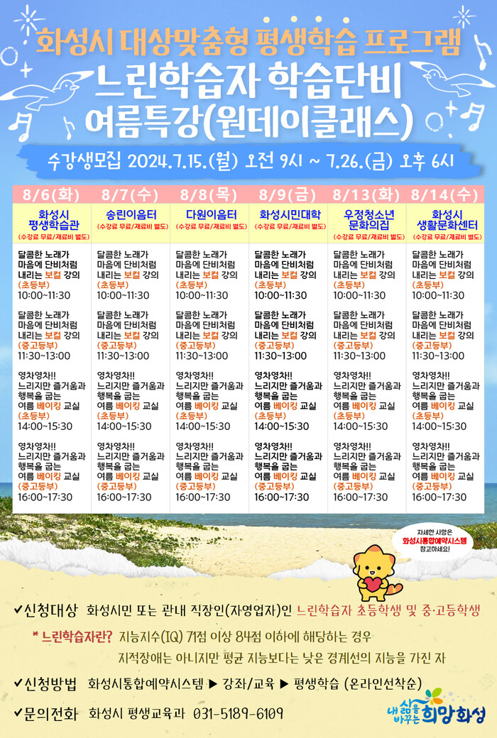 화성시(시장 정명근)가 15일부터 오는 26일까지 ‘느린학습자 학습단비’ 여름특강(원데이클래스) 수강생을 선착순 모집한다.