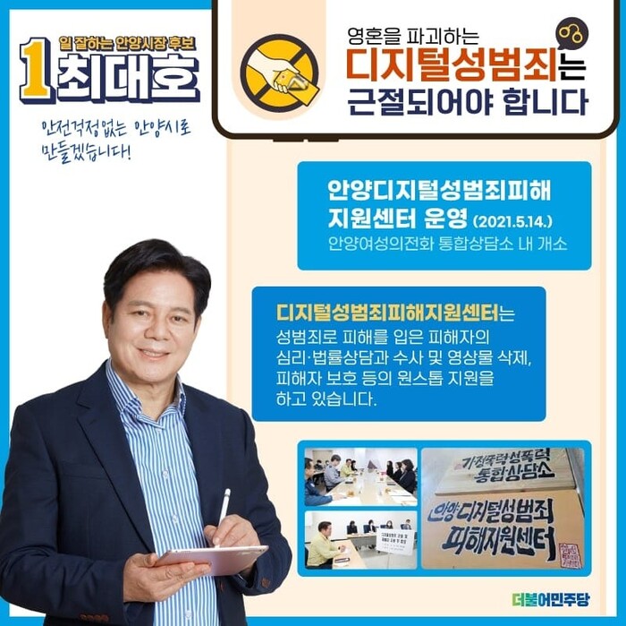 [로컬라이프] 송준형 기자 = 최대호 안양시장 예비후보(더불어민주당)는 디지털 성범죄는 여성들의 생존과 연결된 안전을 위협하는 중범죄라고 강조했다.