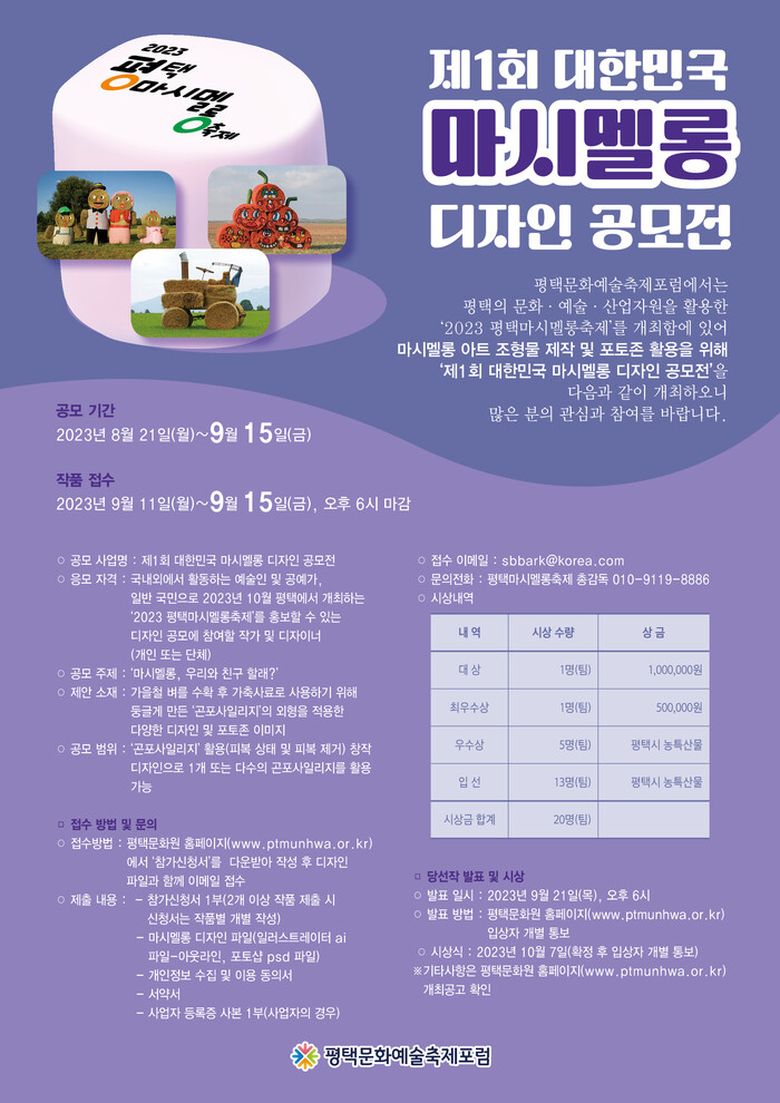평택문화예술축제포럼이 오는 10월 6일부터 8일까지 평택시농업생태원에서 개최하는 ‘2023 평택마시멜롱축제’에서 마시멜롱을 활용한 아트 조형물 제작과 포토존에 사용하게 될 디자인을 9월 11일부터 9월 15일까지 공개모집한다.