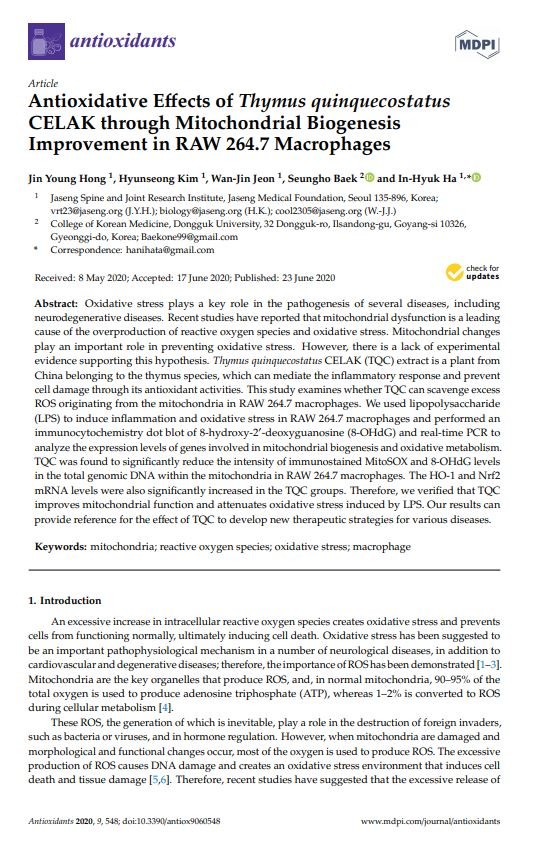 「Antioxidative Effects of Thymus quinquecostatus CELAK through Mitochondrial Biogenesis Improvement in RAW 264.7 Macrophages」