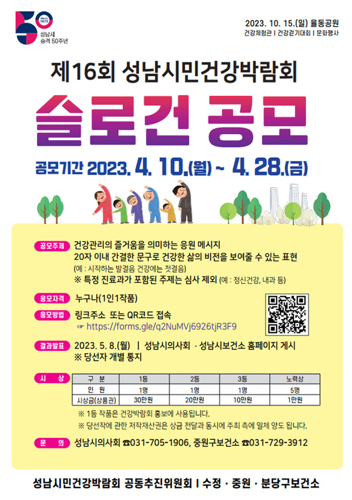 1등 작품은 오는 10월 15일 율동공원에서 열리는 성남시민건강박람회 슬로건으로 쓰인다.