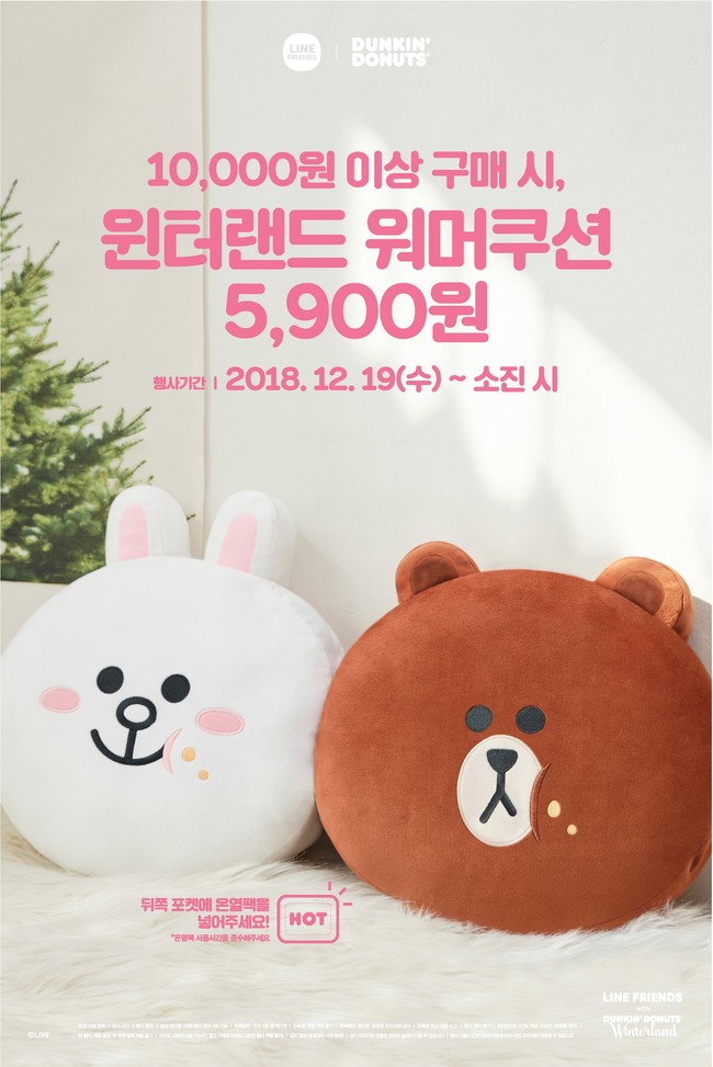 ‘라인프렌즈 with 던킨도너츠 윈터랜드’ 캠페인을 통해 선보이는 마지막 프로모션 상품으로, ‘브라운 워머쿠션’과 ‘코니 워머쿠션’ 2종으로 만나볼 수 있다.