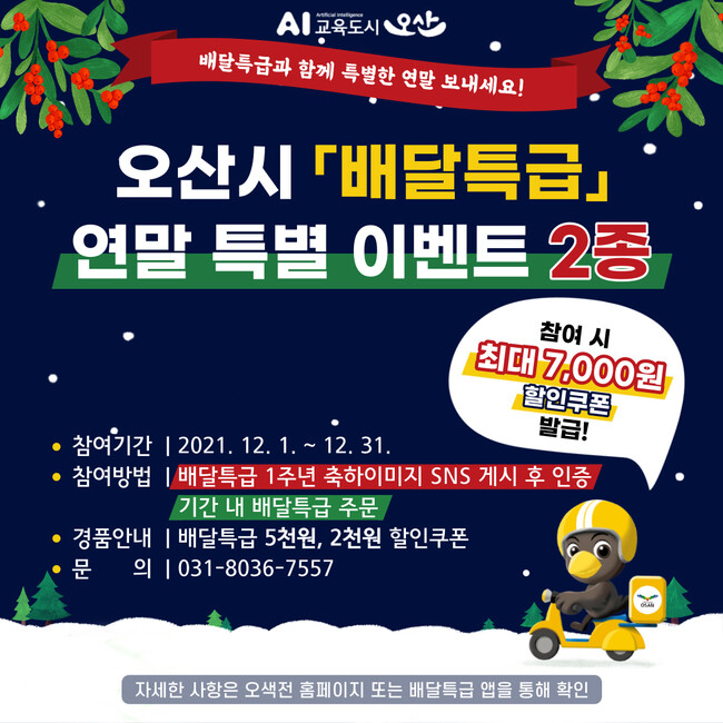 또한, ‘배달특급과 함께하는 특별한 연말!’이벤트는 12월 13일부터 12월 31일까지 진행한다. 해당 기간 동안 배달특급 오산시 회원 중 선착순 750명을 대상으로 2천 원 할인쿠폰을 지급하며 쿠폰은 배달특급 이벤트 페이지를 통해 지급 받은 후 즉시 사용할 수 있다.