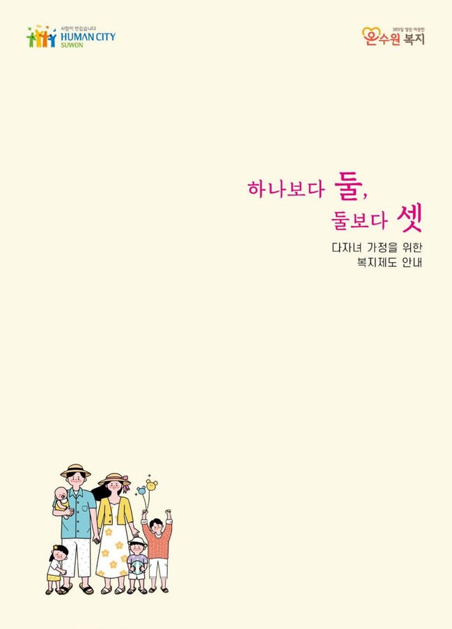 수원시가 다자녀 가정을 위한 복지제도 안내서 ‘하나보다 둘, 둘보다 셋’을 발간했다. 다자녀 가정에 제공하는 20여 개 혜택을 일목요연하게 정리했다.