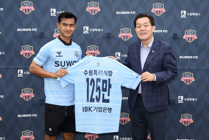 사진/아르한 선수가 이재준 수원시장에게 써드 유니폼을 전달하고 있다.(사진제공=수원시)