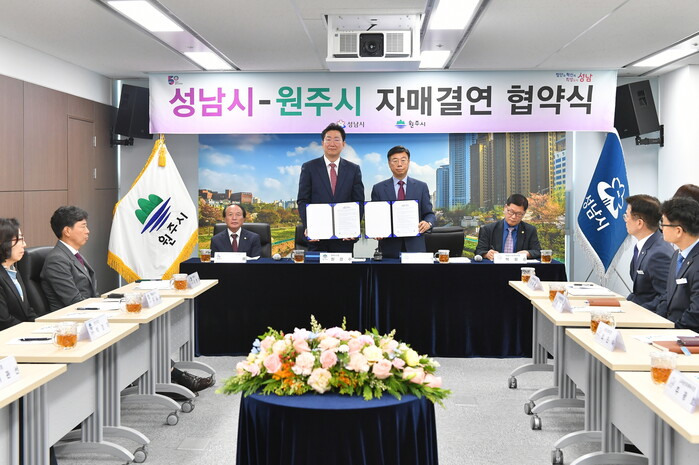 성남시는30일 시청 상황실에서 강원도 원주시와 상호 교류 및 우호 증진 협력을 위한 자매결연 협약을 체결했다.