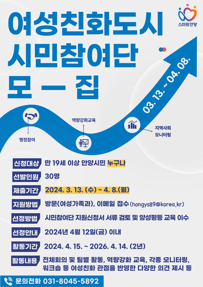 안양시는 모두가 차별없이 행복한 여성친화도시 조성에 함께할 ‘여성친화도시 시민참여단’을 다음달 8일까지 모집한다고 14일 밝혔다.