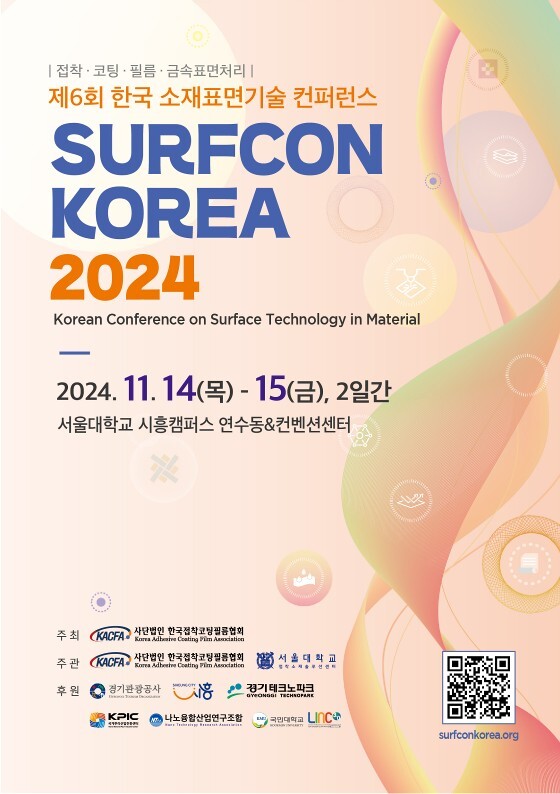 서울대학교 시흥캠퍼스 컨벤션센터에서 11월 14일부터 15일까지 ‘제6회 한국 소재표면기술 콘퍼런스(이하, 서프콘 코리아 2024)’가 열린다. 이번 콘퍼런스는 나노 재료 표면 기술과 분해성 폴리머의 재료 및 필름 등 최근 이슈가 되고 있는 바이오 분야의 접착 기술을 중점으로 진행된다.