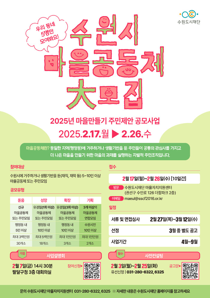 이병진 수원도시재단 이사장은 “이번 공모사업으로 주민이 주도적으로 마을을 변화시키고, 지속 가능한 공동체를 만들어갈 수 있도록 지원하겠다”며 “많은 주민이 참여해 마을공동체 활성화의 주역이 되길 바란다”고 밝혔다.
