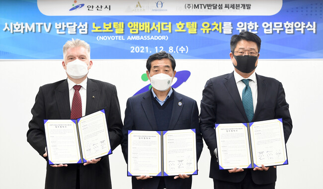 안산시는 8일 시화MTV 반달섬 부지 내 노보텔 앰배서더 호텔 유치를 위해 아코르 앰배서더 코리아, ㈜MTV 반달섬 씨세븐개발과 업무협약을 체결했다고 밝혔다.
