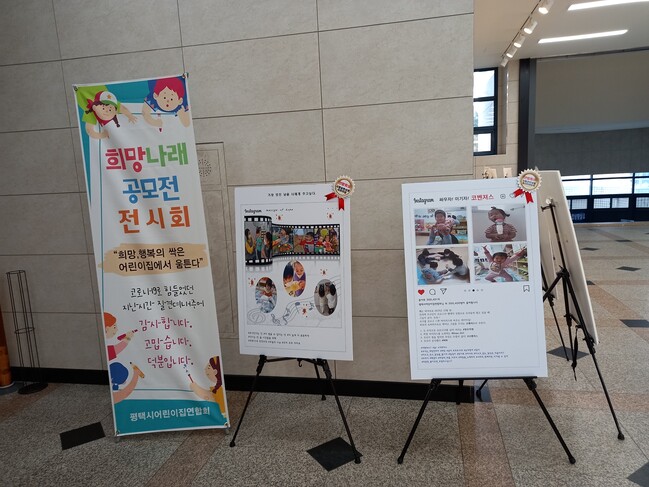 (사)한어총 경기도어린이집연합회 평택지회(회장 김의향)가 코로나19로 펜데믹에 빠진 사람들에게 희망을 전달하는 ‘희망나래’ 전시회를 2일부터 5일까지 평택시청 로비에서 개최하고 있다.