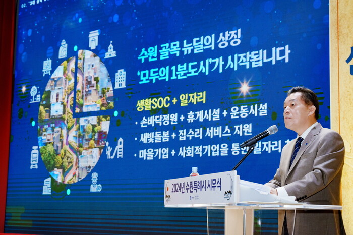 2일 시청 대강당에서 열린 ‘2024 수원특례시 시무식’에서 신년사를 발표한 이재준 수원시장은 “2023년이 민선 8기의 기초를 세우고 새로운 정책을 시작하는 해였다면, 2024년은 시민 삶이 더 나아지도록 변화를 만들어 내는 해가 될 것”이라며 ▲시민이 체감하는 경제성장 ▲3대 골목 뉴딜 ▲도시 혁신 ▲세계적 문화수도 조성 등 4가지 방향을 제시했다.