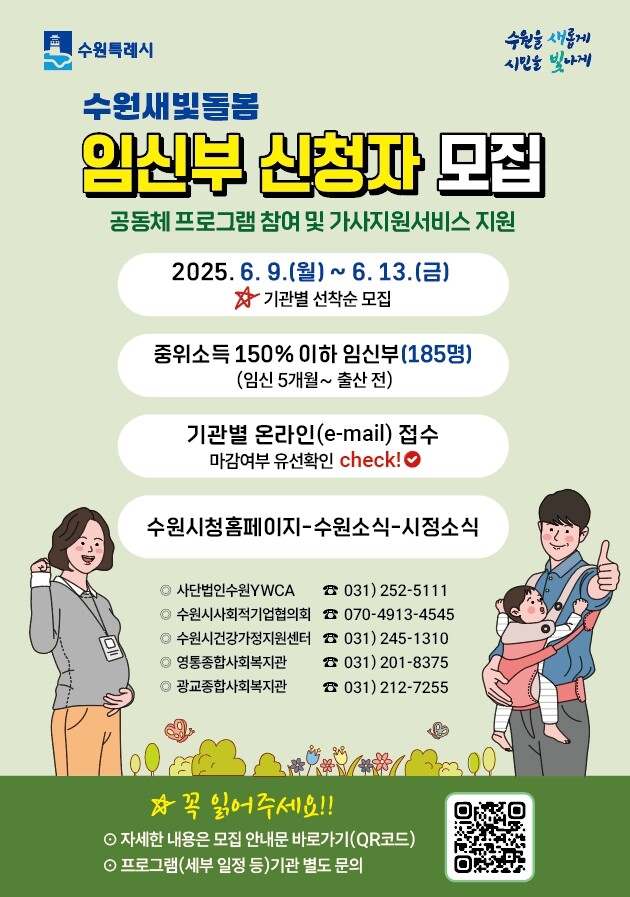 수원시가 6월 9일부터 13일까지 ‘수원새빛돌봄 임신부 돌봄공동체 지원사업’에 참여할 임신부 185명을 선착순으로 모집한다.