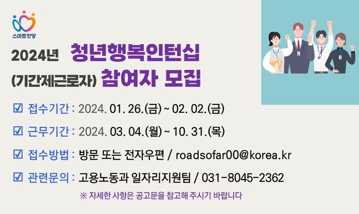 안양시가 취업 취약계층인 청년 구직자에게 직장 체험 기회를 제공하고 취업역량을 강화할 수 있도록 하기 위한 ‘청년행복 인턴십’ 참여자를 모집한다고 23일 밝혔다.