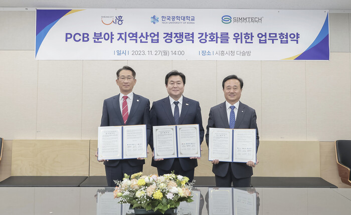 시흥시(시장 임병택)는 지난 27일 시청 다슬방에서 한국공학대(총장 박건수)-(주)심텍(대표이사 최시돈)과 ‘인쇄회로기판(PCB) 분야 지역산업 경쟁력 강화를 위한 업무 협약’을 체결했다.