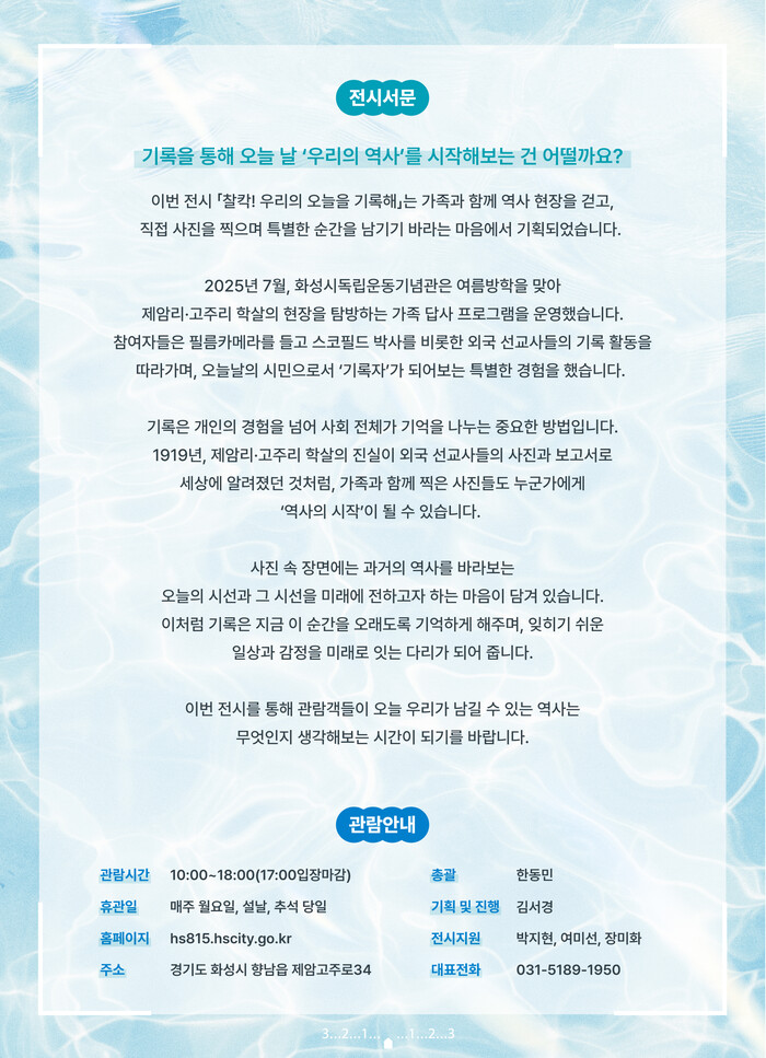 화성특례시(시장 정명근)가 오는 15일부터 9월 28일까지 화성시독립운동기념관 로비에서 광복 80주년 기념 시민 참여형 사진전 ‘찰칵! 우리의 오늘을 기록해’를 개최한다.