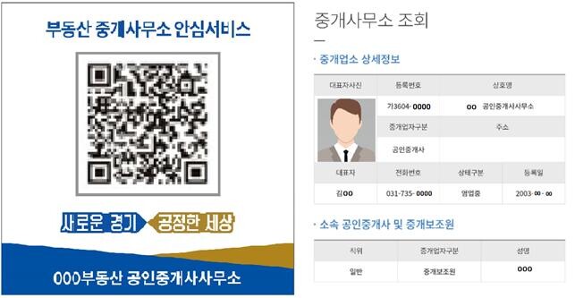 명찰에는 성명, 사진, 소속 사무소 명칭, 등록번호가 기재돼 본인 여부를 쉽게 확인할 수 있으며, 업소 등록정보 역시 중개업소에 부착된 QR코드를 통해 조회가 가능하다.