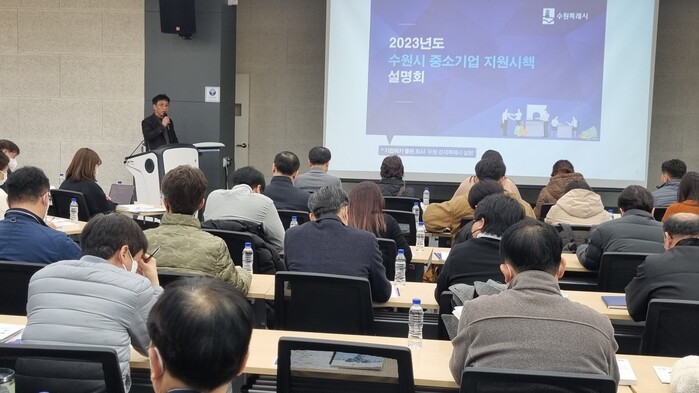 사진/수원시가 ‘2023년 중소기업 지원시책 설명회’를 진행하고 있다.(사진제공=수원시)
