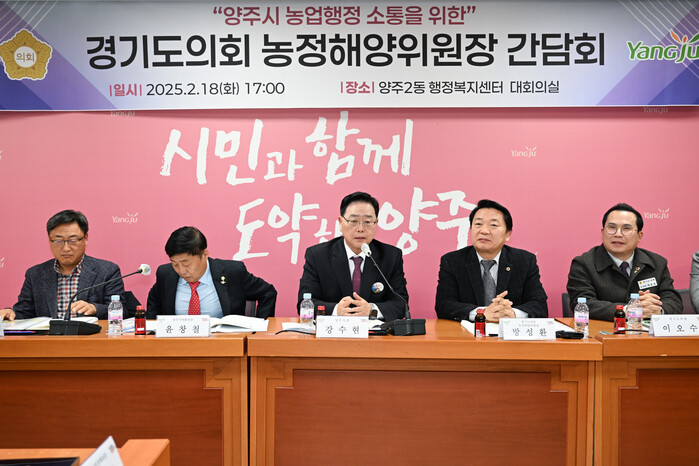 강수현 양주시장이 최근 ‘양주2동 행정복지센터 대회의실’에서 열린 ‘경기도의회 농정해양위원장 간담회’에 참석해 관내 주요 농정 과제에 대한 실효성 있는 지원을 요청했다.