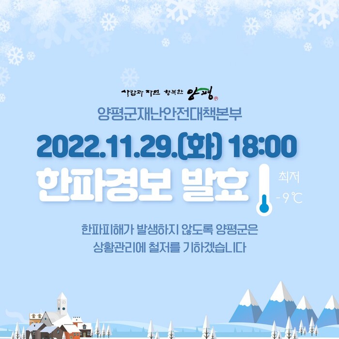 [로컬라이프] 송준형 기자 = 전진선 양평군수는 29일, 저녁부터 기온이 급격히 떨어져 11. 29.(화) 18:00부로 한파경보가 발효될 예정이라고 밝혔다.