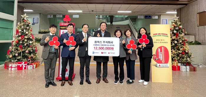 올릭스 이동기 대표이사는 18일 수원시청을 방문해 본관에 설치된 사랑의 온도탑 앞에서 박란자 복지여성국장에게 성금을 전달했다.