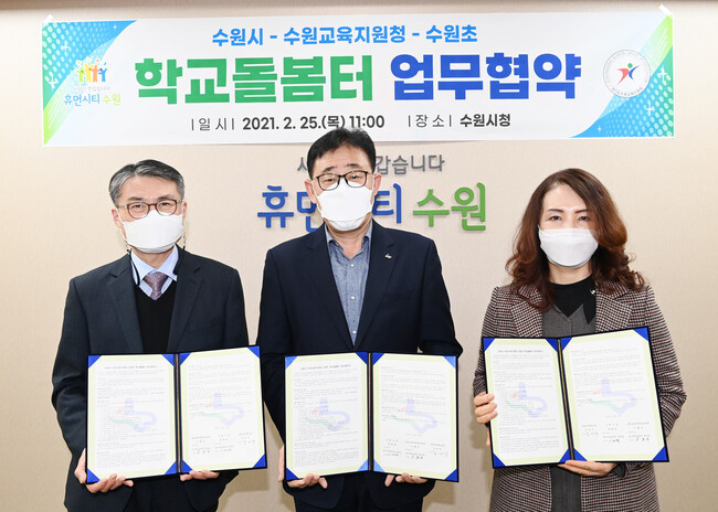 수원시와 수원교육지원청, 수원초등학교는 25일 시청 별관 귀빈실에서 ‘학교돌봄터 운영을 위한 업무협약’을 체결하고, 초등학생 돌봄 공백을 해소하는 데 협력하기로 했다.