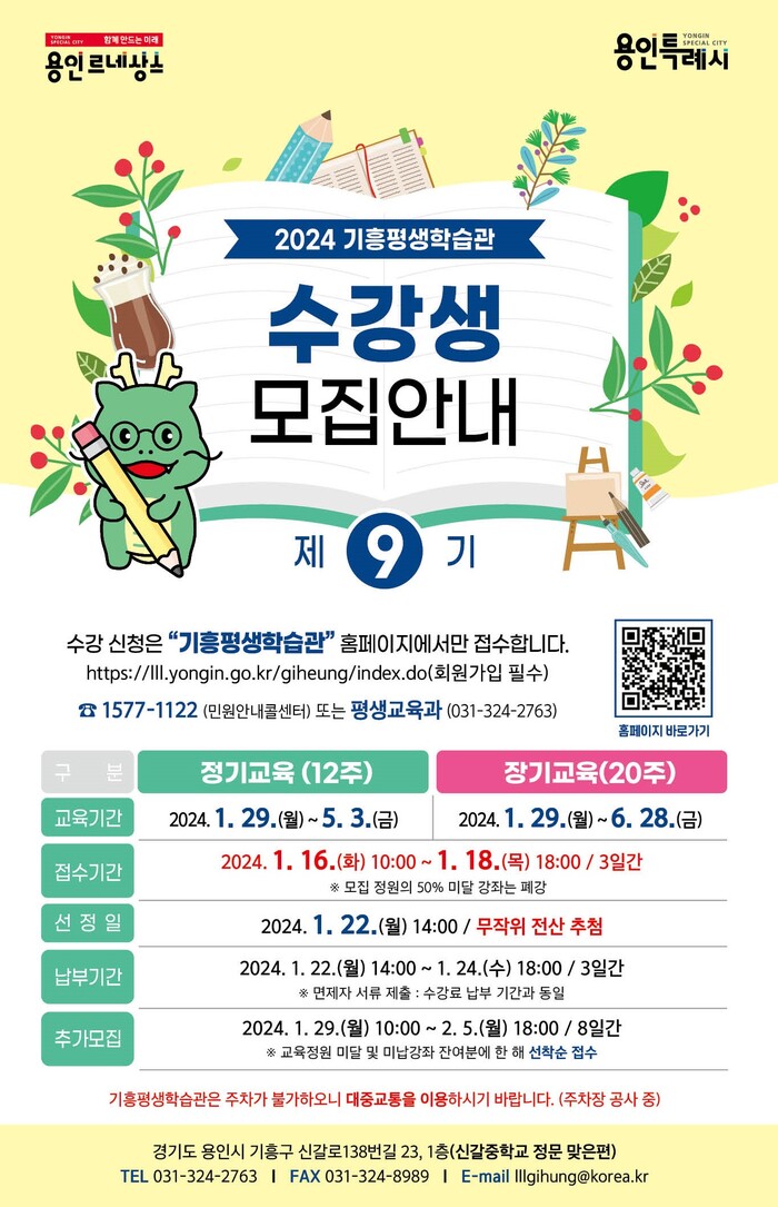 용인특례시(시장 이상일)는 오는 16일부터 18일까지 기흥평생학습관 ‘제 9기 교육프로그램’ 수강생을 모집한다고 15일 밝혔다.