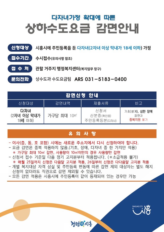 지난 5월 9일에 공포된 ‘시흥시 다자녀 우대 및 지원’ 조례 제정에 따르면, 상하수도 요금 감면 대상이 기존에 ‘시흥시에 주민등록을 둔 3자녀 이상 가정에서 막내가 만 15세 이하인 경우’에서, ‘2자녀 이상 가정에서 막내가 18세 이하인 경우’로 확대 시행된다.