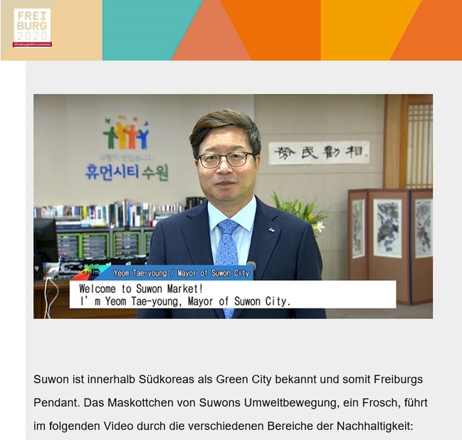 수원시와 자매결연을 하고 환경 분야를 주축으로 다양한 교류를 하고 있는 독일의 자매도시 프라이부르크 홈페이지(http://2020.feriburg.de)에 지난 10일 수원시 관련 영상들이 다수 게시됐다.