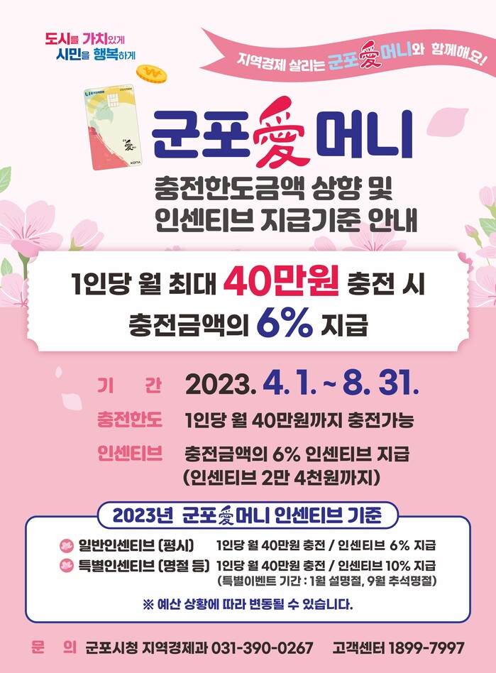 군포愛머니 운영계획에 따르면 인센티브율은 변동없이 평시에 일반 인센티브6%를,설⋅추석이 있는 명절(1월, 9월)에는 특별 인센티브10%를 지급하고 있다.